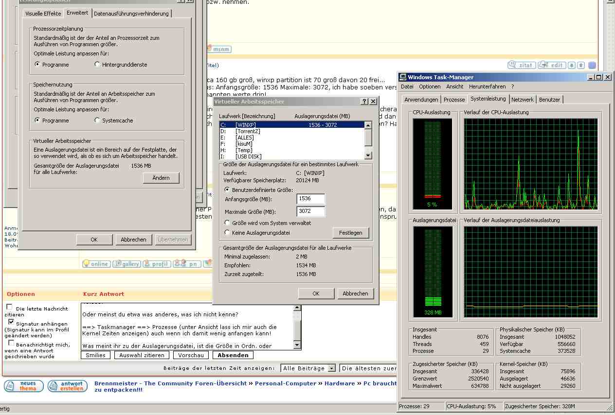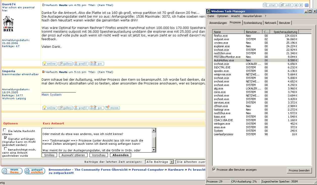 Was wäre Optimal für meinen Rechner? Firefox ereicht manchmal schon 100.000 bis 170.000 Speicherauslastung, da ich oft viele Fenster und tabs öffne. Danach kommt meistens outpost mit 36.000 Speicherauslastung unddann die explorer.exe mit 25.000 und dann not32krn.exe (antivirus) mit 22.000. Außerdem manchmal git der prozi auf volle pulle auch wenn ich nicht weiß was ist jetzt los, warum zieht er so schnell davon? Hab echt keine Ahnung von der Materie und freue mich über euer feedback.